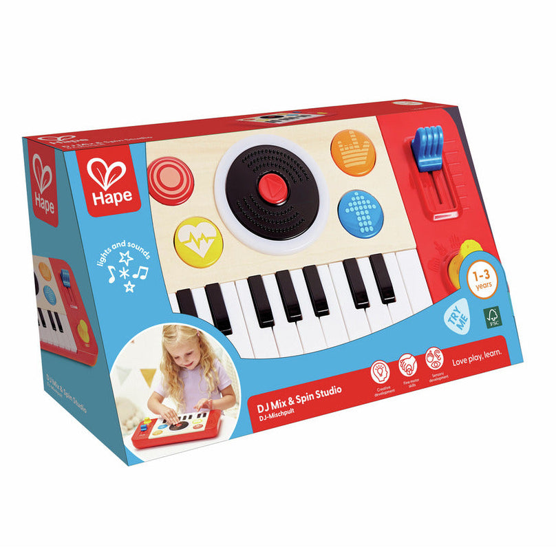 Help your little ones spin their first tunes with this portable DJ studio! 18 fun sound effects, 5 background tunes, and 4 DJ noises to mix. Ages 1+