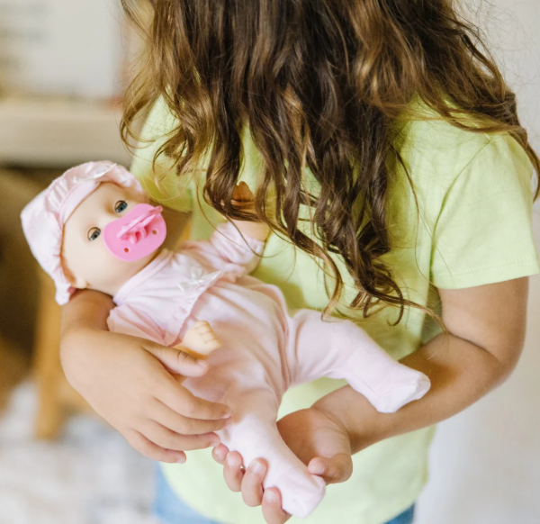 - The Melissa & Doug Mine to Love Jenna 12-Inch Soft Body Baby Doll features eyes that open and close and sweet baby cheeks; additionally, she can suck her thumb or pacifier.
