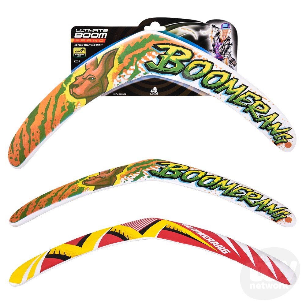 Enjoy playing with Ultimate Boomerang. Made of soft aerodynamic foam, this boomerang flies smooth and is easy to catch. This high-performance super safe boomerang really returns to the thrower and is made from brightly colored soft-grip aerodynamic foam. Instructions included. Product includes 1 Ultimate Boomerang. Colors vary, let us choose for you! Ages: 6+